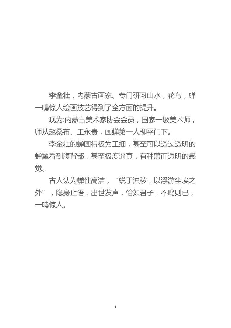 李金壮,内蒙古画家。专门研习山水,花鸟,蝉一鳴惊人绘画技艺得到了全方面的提升。现为:内蒙古美术家协会会员,国家一级美术师,师从赵桑布、王永贵,画蝉第一人柳平门下。