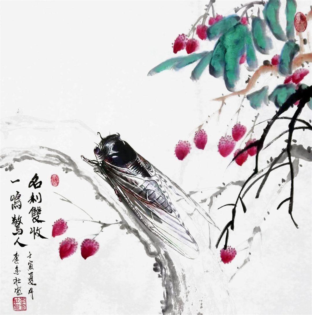 李金壮的蝉画得极为工细,甚至可以透过透明的蝉翼看到腹背部,甚至极度逼真,有种薄而透明的感觉。